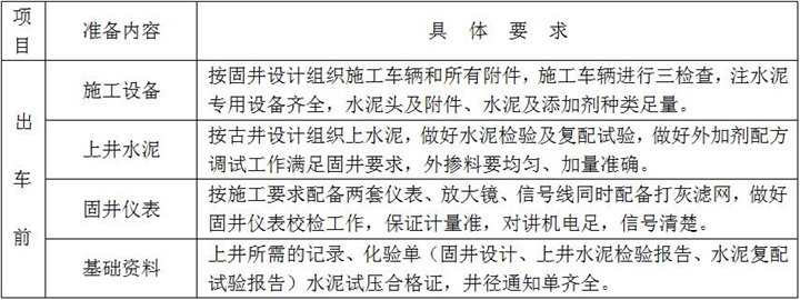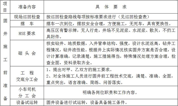 固井施工準備是落實固井施工方案和固井設計重要的一個環(huán)節(jié),是固好一口井的前期準備工作,具體內(nèi)容及要求如下: